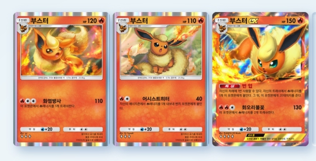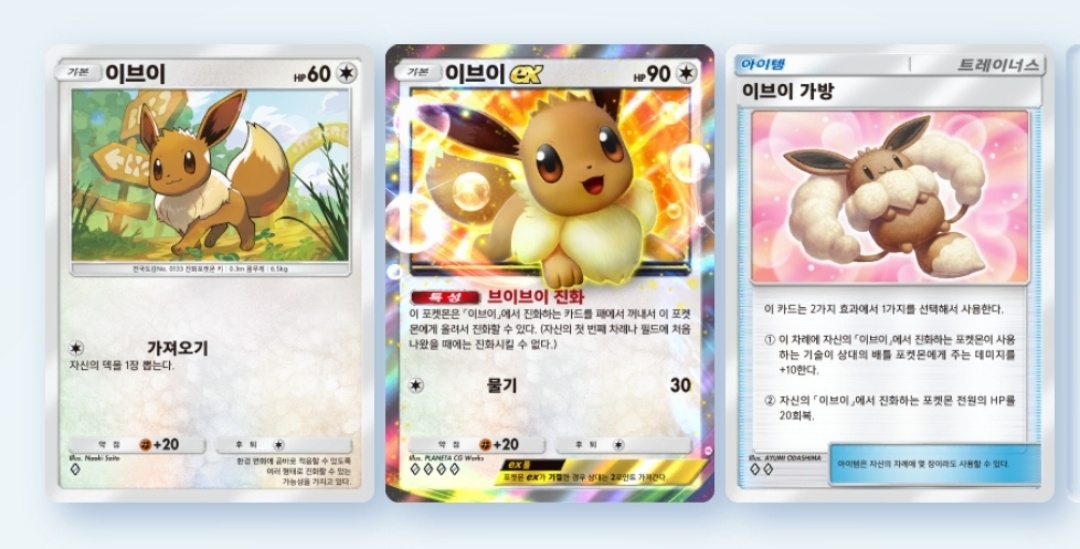 이번 확장팩에는 제목 그대로 이브이와 그 진화체가 총출동한다. 그 덕분에 작정하고 이브이덱을 종류별로 구성할 수 있게 됐다. 이번 확장팩을 통해 구성 가능해진 이브이 덱은 부스터, 님피아, 글레이시아, 리피아다.