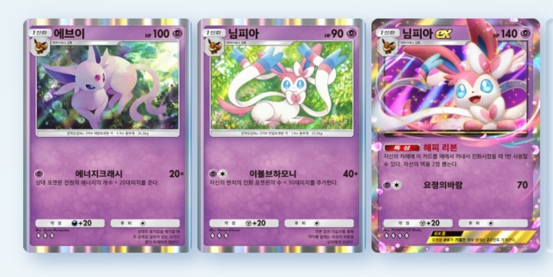 먼저 에스퍼 에너지를 활용하는 덱을 소개한다. 이번 확장팩을 통해 '님피아ex'가 추가되었고, 이와 함께 낮은 등급의 님피아와 에브이도 등장해 에스퍼 속성으로 진화하는 이브이덱 구축이 가능해졌다. 사용에너지가 낮아서 운영 난도는 낮다. 대신 님피아는 자신, 에브이는 상대의 다른 상황에 의존하기에 언제나 최상의 결과를 장담할 수는 없다.