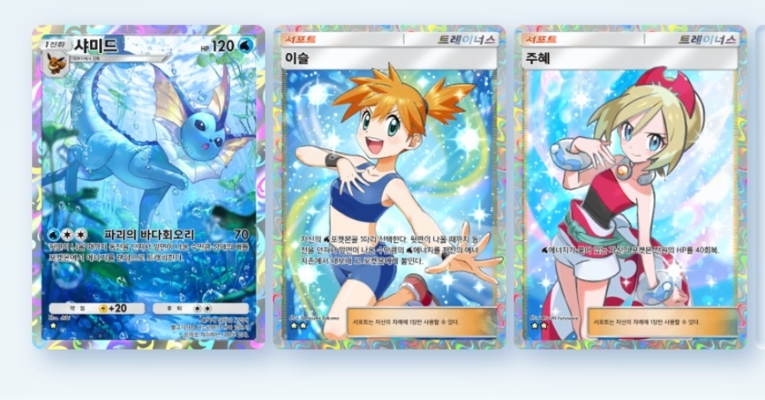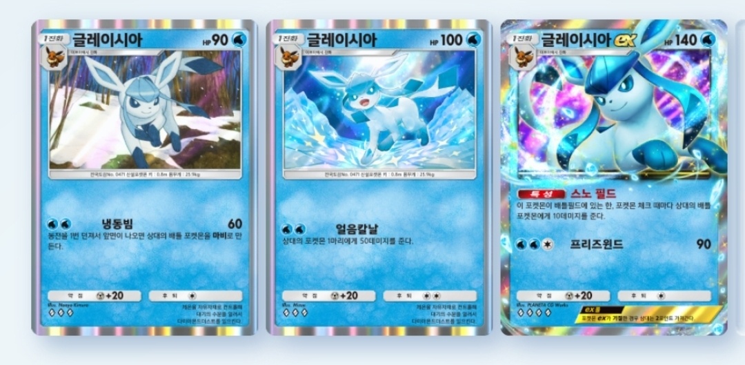 물 타입은 이번에 추가된 것을 포함해 총 6종의 카드가 준비돼 있어 이브이 덱 중에서 가장 다양하게 구성할 수 있다. 샤미드 3종, 글레이시아가 3종이 있다.