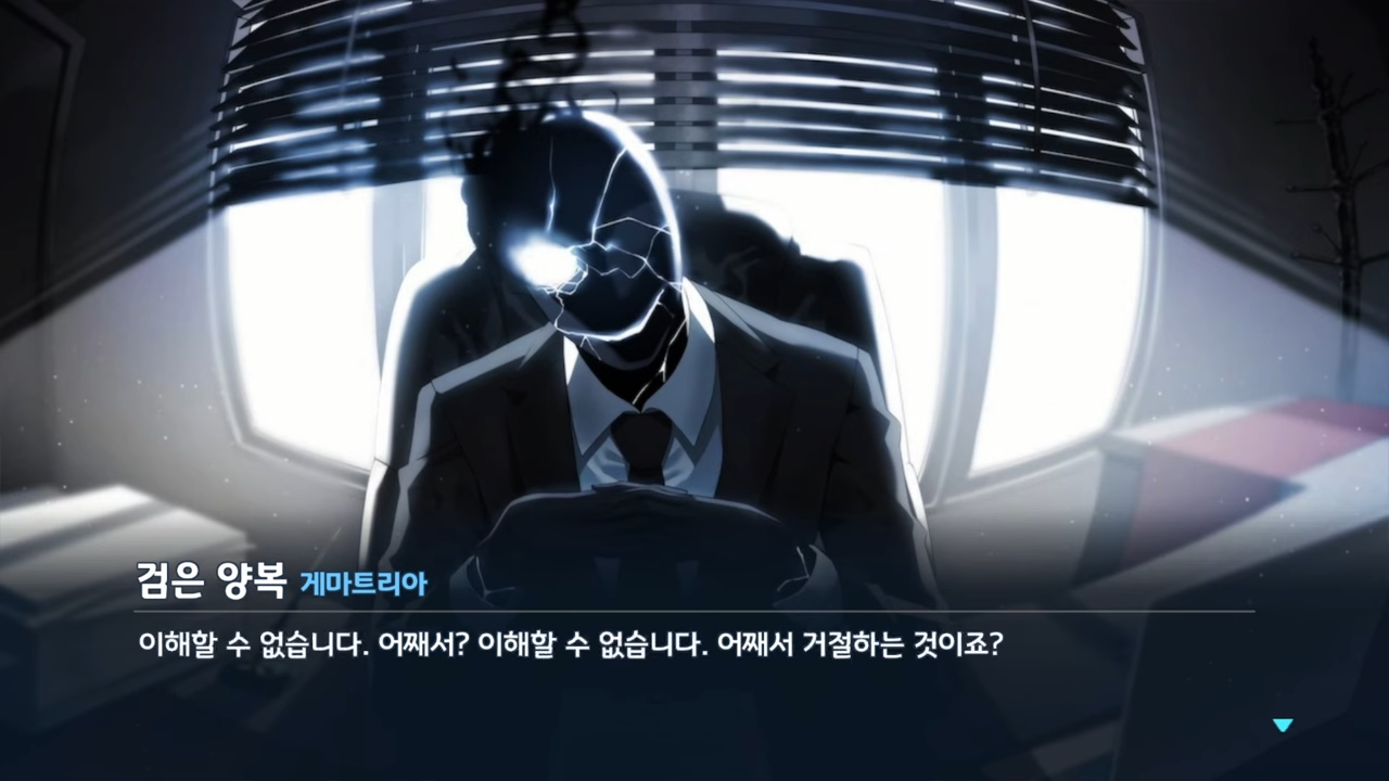 영상은 악역 집단 게마트리아소속의 '검은 양복'이 주인공인 선생님과 설전을 벌이는 부분이다. 선생님은 성우가 없어 '검은 양복'역의 김혜성 성우의 단독 열연을 볼 수 있다. 유저들은 이성적이면서도 사악한 검은 양복의 분위기를 매우 잘 살렸다고 평가했다.