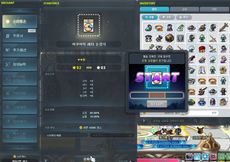 장비 강화에도 소소하지만, 무시할 수 없는 혜택이 적용된다. 먼저, 스타포스 강화에서는 10성 이하 구간에서 강화 성공 시 1+1 효과로 한 번에 2성씩 올라가는 혜택을 제공한다. 또한 주문의 흔적 강화에서는 필요한 주문의 흔적 비용도 절반으로 감소해, 장비 강화의 부담을 크게 줄일 수 있다.