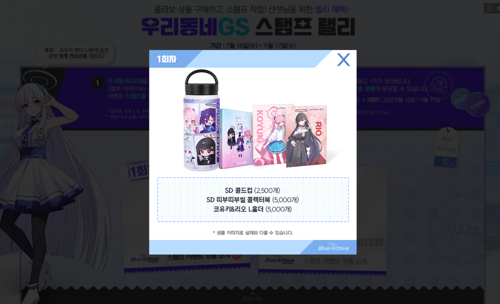 장기간에 걸쳐 콜라보가 진행되고 소비자들에게 다양한 굿즈를 제공한다. 특히 블루 아카이브 콜라보 상품을 구매하고 우리동네GS앱을 통해 스탬프를 3개 모을 때마다 특별경품에 응모할 수 있다. 스탬프는 하루 최대 세 개까지 받을 수 있고, 응모 횟수에는 제한이 없다.