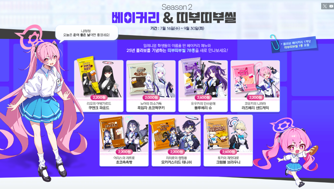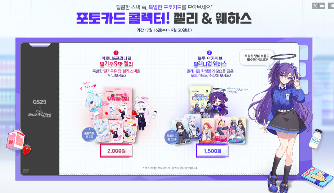 넥슨에서 서비스하는 '블루 아카이브'와 편의점 브랜드 GS25의 콜라보 상세 내용이 공개됐다. 두 번째로 진행되는 편의점 콜라보는 작년 '레빗소대'에서 '세미나'로 바통을 터치한다. 기간은 7월 16일부터 9월 30일까지다.