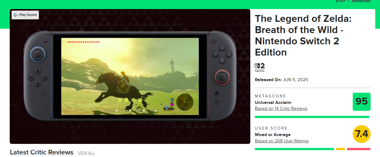 닌텐도스위치2가 출시하고 젤다의 전설 시리즈가 다시 주목받고 있다. 특히 브레스 오브 더 와일드, 티어스 오브 더 킹덤의 스위치2 에디션은 메타크리틱에서 95점에 가까운 점수를 받았고, 미국의 시장 조사 기관 서카나에 따르면 스위치2 발매와 함께 가장 많이 팔린 게임으로 조사되고 있다.