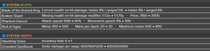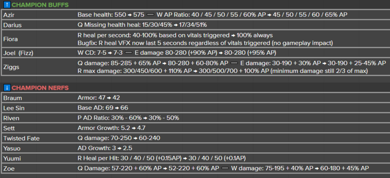 솔로랭크에서도 많은 사랑을 받았던 트위스티드 페이트는 Q스킬의 대미지가 10 감소하며, 야스오는 성장 공격력이, 유미는 궁극기 힐량에 대한 AP 계수가 감소한다. 조이는 Q와 W 스킬의 초반 피해량이 모두 하향돼 라인전에서의 강력함이 줄어들 예정이다.