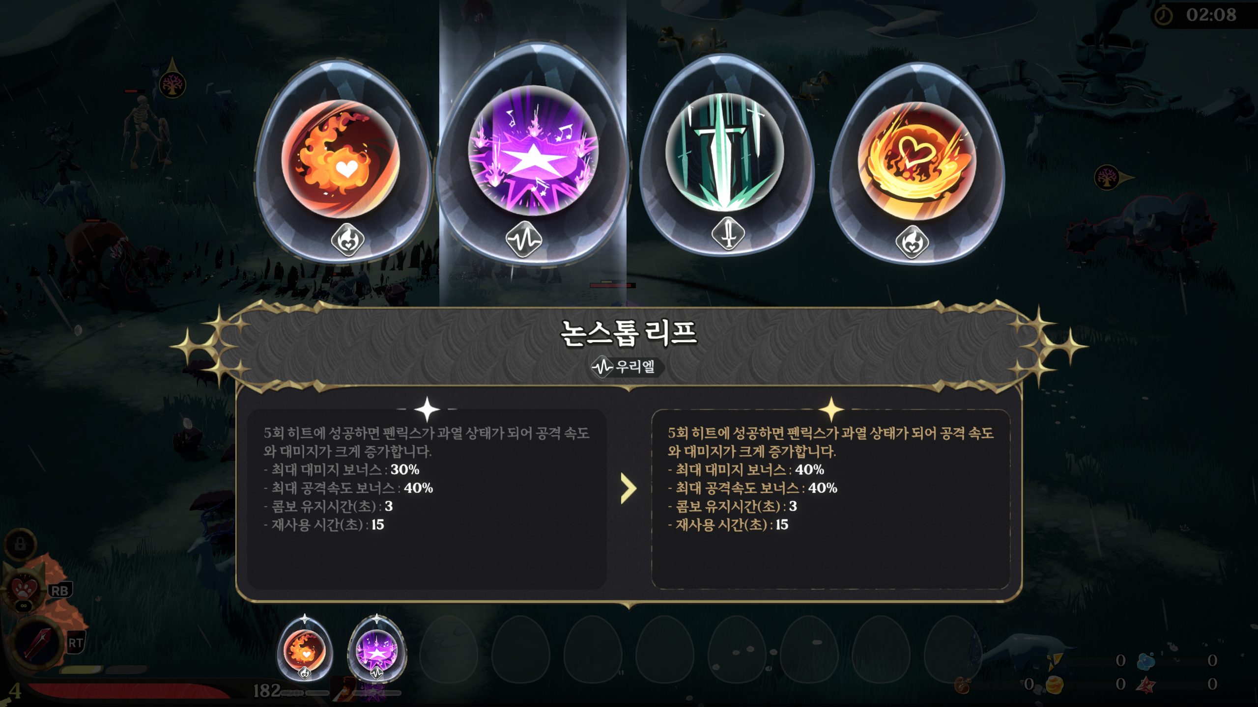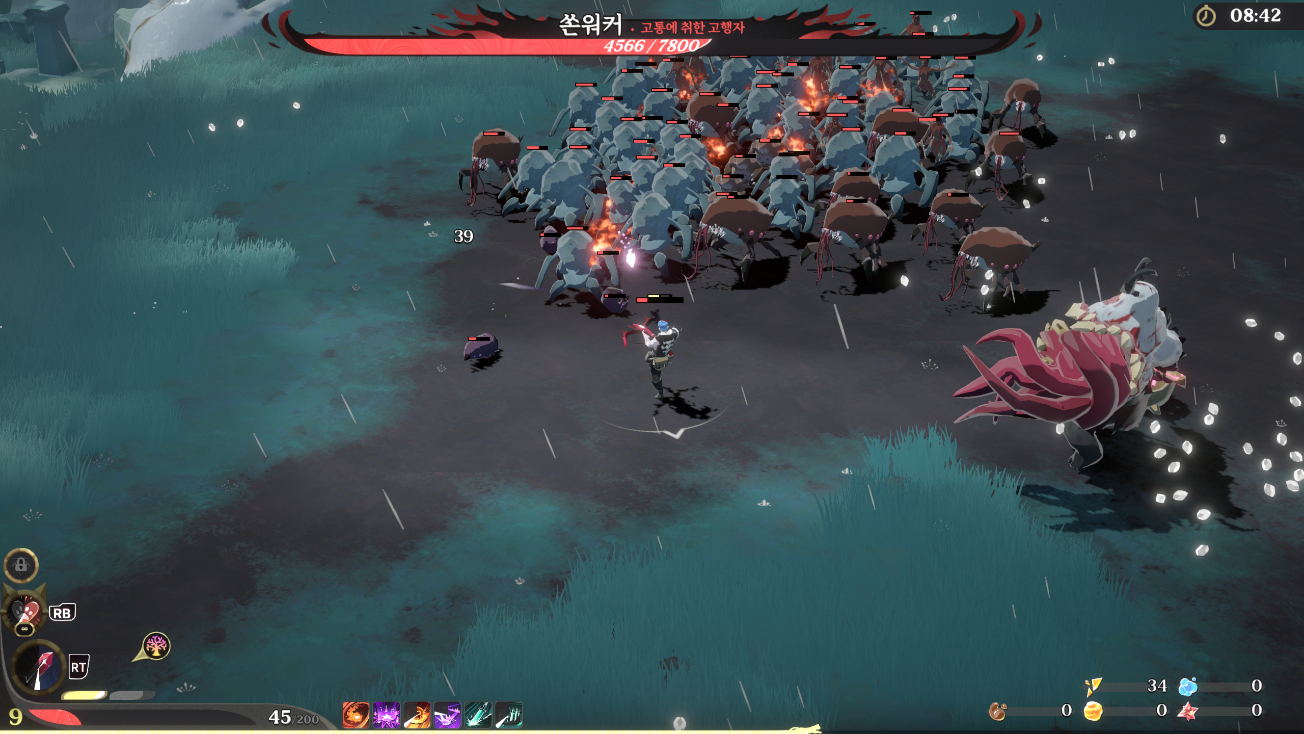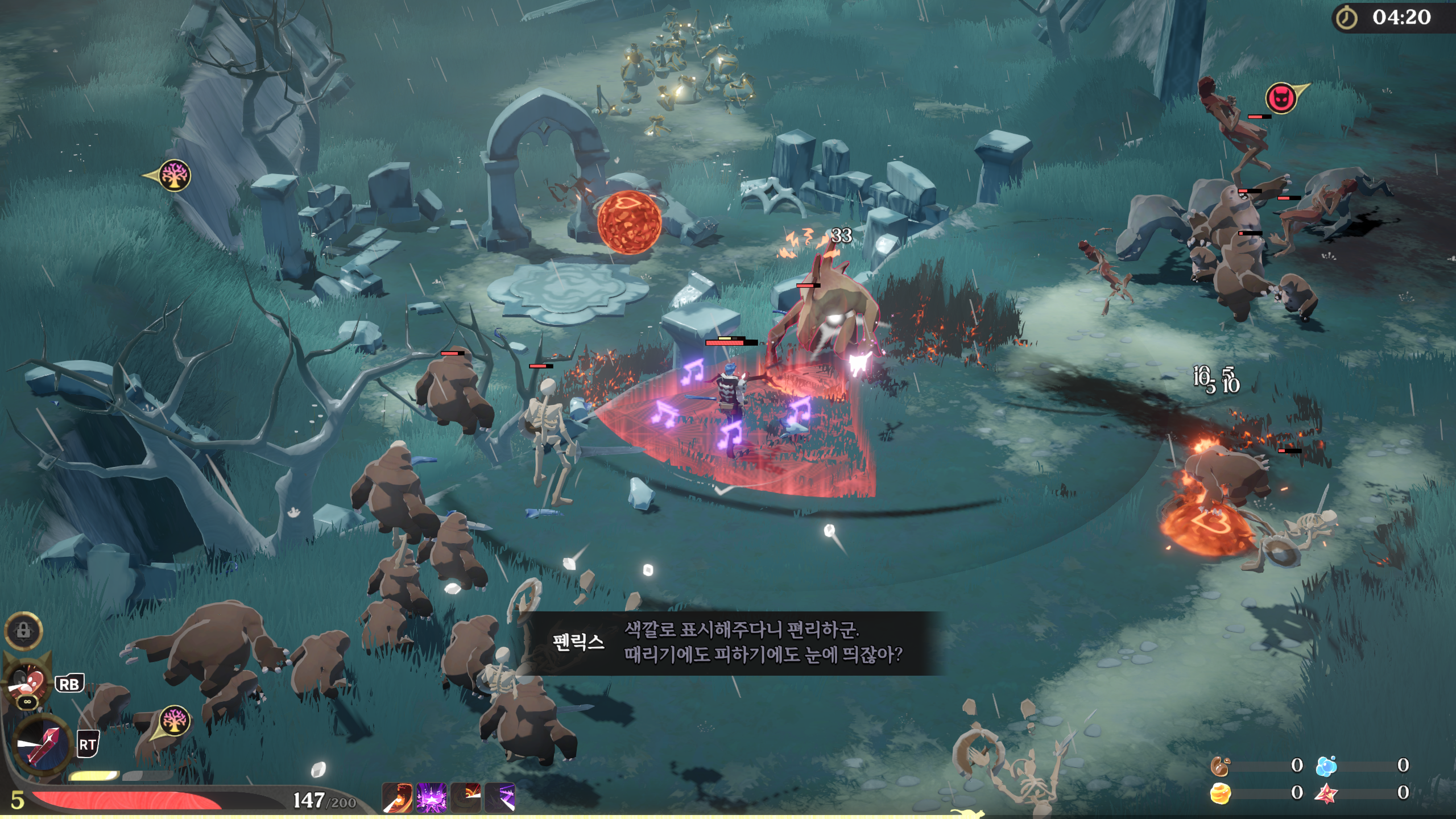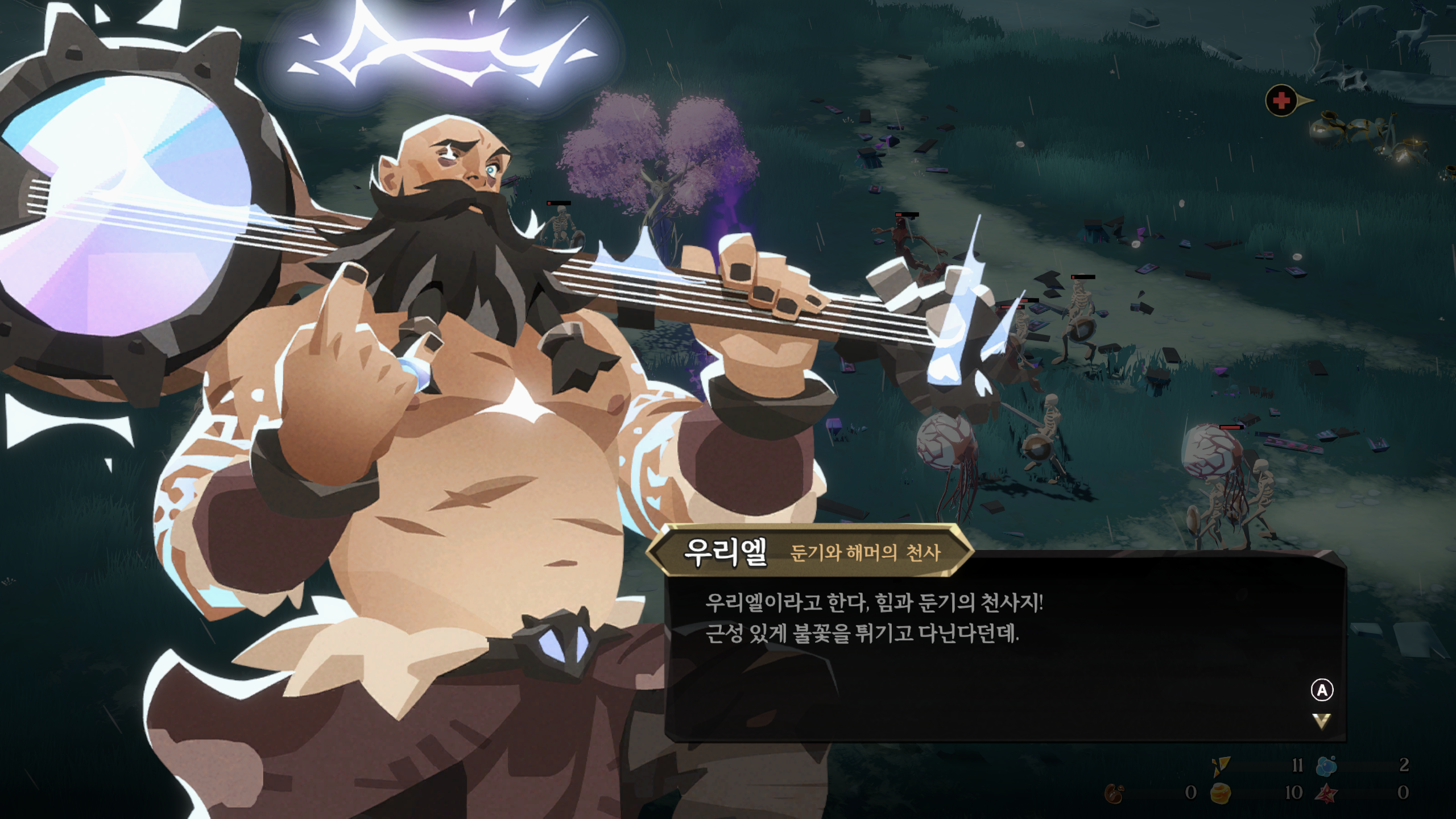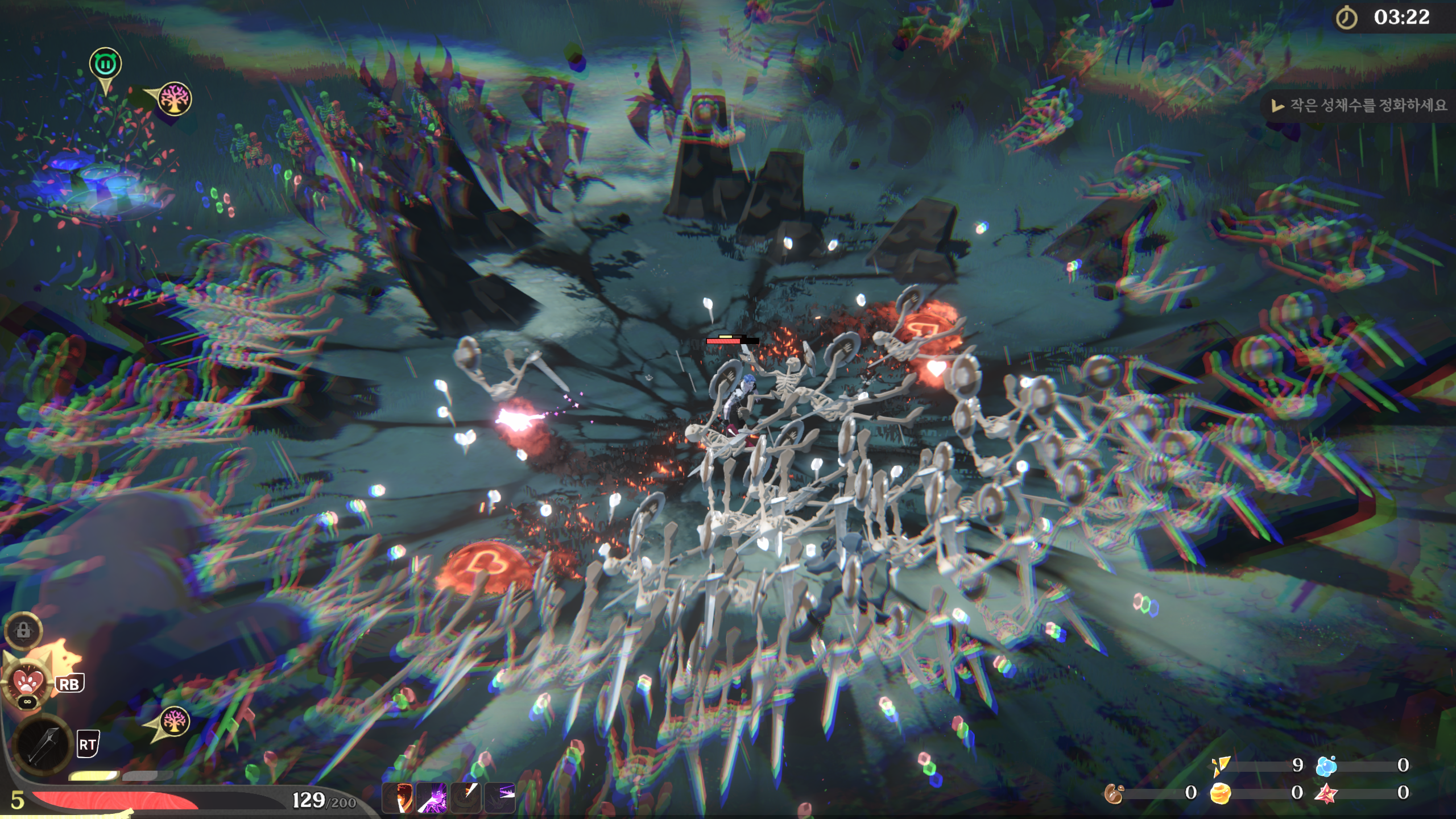 장르의 기본도 충실하게 지켰다. 주인공의 레벨이 오를 때마다 스킬을 하나씩 입수할 수 있는데 모두 자동으로 사용된다. 시연판에서는 총 3종의 추가 능력 빌드를 확인할 수 있었다. 각각 주무기, 보조무기와 자동 공격을 중심으로 하는 빌드다.