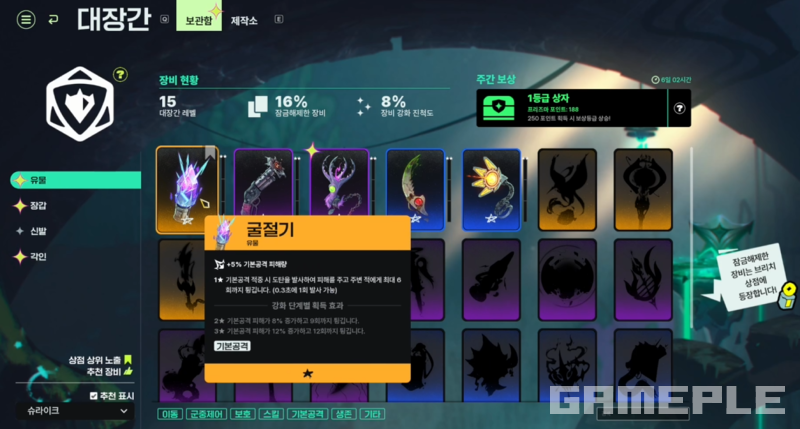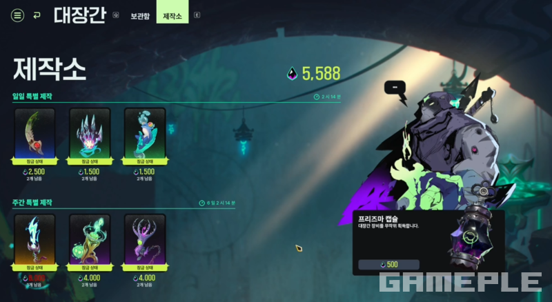 대장간에서는 프리즈마라는 전용 재화를 활용해 유물과 각인 등 다양한 장비를 해금하고, 이를 기반으로 사전에 빌드를 세팅해 전투에 들어가게 된다. 특히 유물은 단순한 장비가 아니라 고유의 액티브 스킬을 제공하는 전투의 핵심이다.