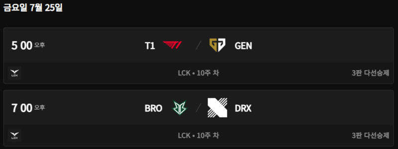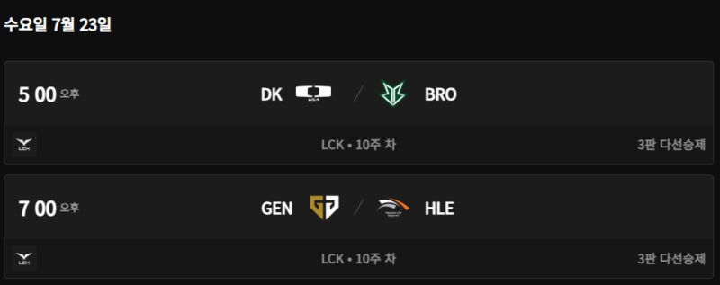 3라운드 개막일인 7월 23일에는 오후 5시에 디플러스 기아와 OK저축은행 브리온의 1경기가, 이어지는 7시에 젠지와 한화생명e스포츠가 맞붙는 2경기가 펼쳐진다. 특히 젠지와 한화의 경기는 2025 EWC 무대를 누볐던 팀들의 맞대결이라는 점에서 팬들의 뜨거운 관심을 받고 있다.