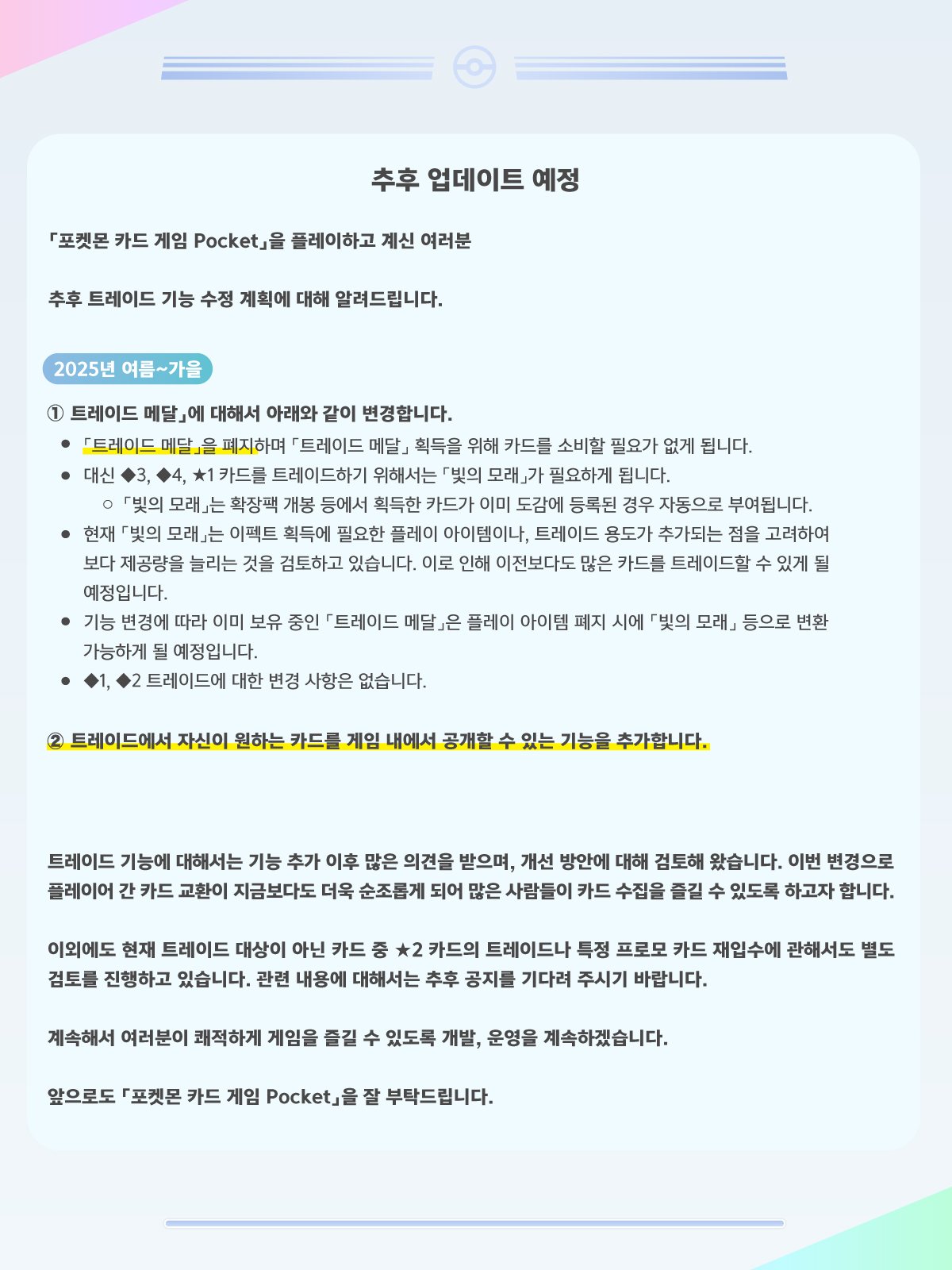 다만 아쉽게도 포켓의 트레이드 시스템에서 가장 비판을 받았던 고 레어 카드 교환 추가에 대해서는 언급되지 않았다. 이에 대해서는 향후 순차적으로 개방하겠다는 방향성을 바꾸지 않을 것으로 보인다.
