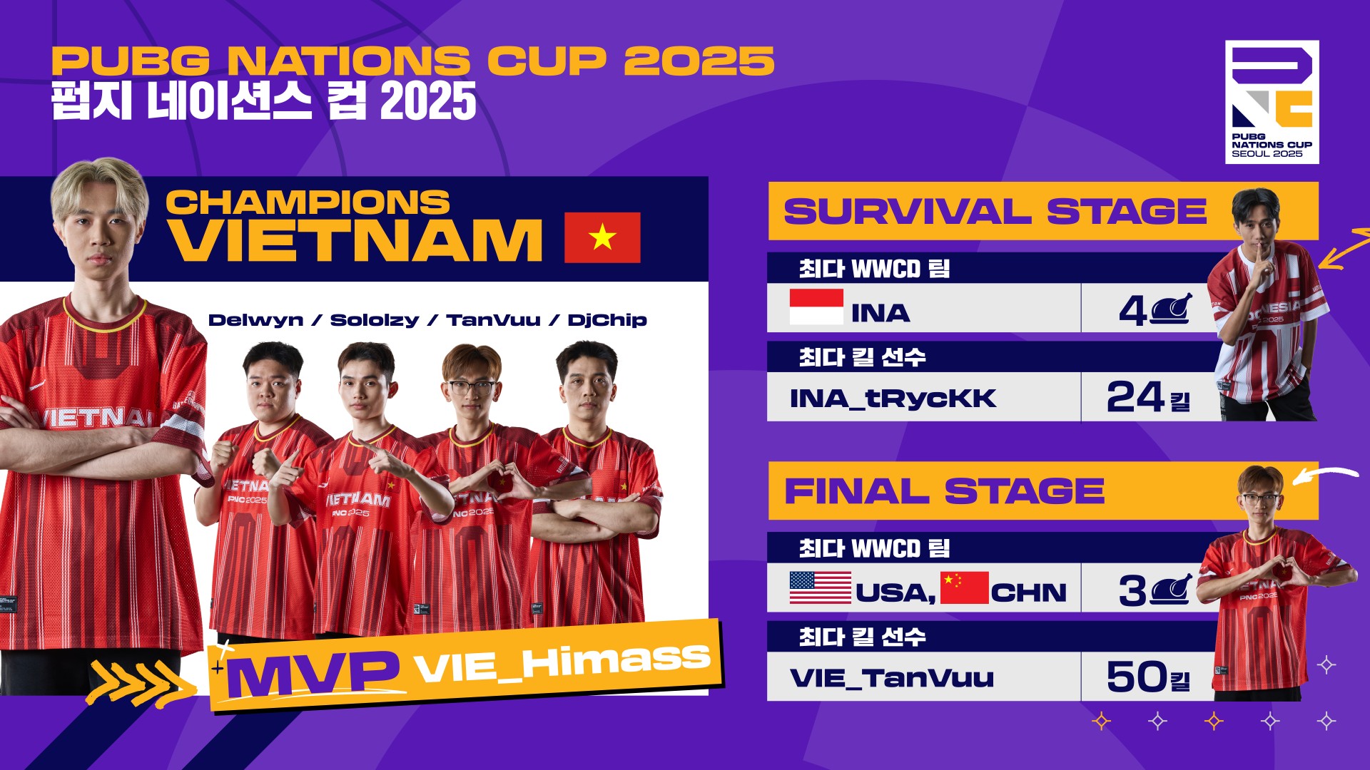 7월 25일부터 27일까지 3일간 펼쳐진 파이널 스테이지 최종 결과, 베트남 대표팀은 누적 포인트 216점으로 우승 트로피를 들어올렸다. 케르베로스 e스포츠와 디 익스펜더블스 등 베트남 프로팀 출신 선수들로 구성된 대표팀은 강력한 전투력과 안정적인 운영을 바탕으로 세계 정상에 올랐으며, ‘히마스’ 선수는 총 44킬과 7,935 대미지를 기록하며 MVP에 선정됐다.