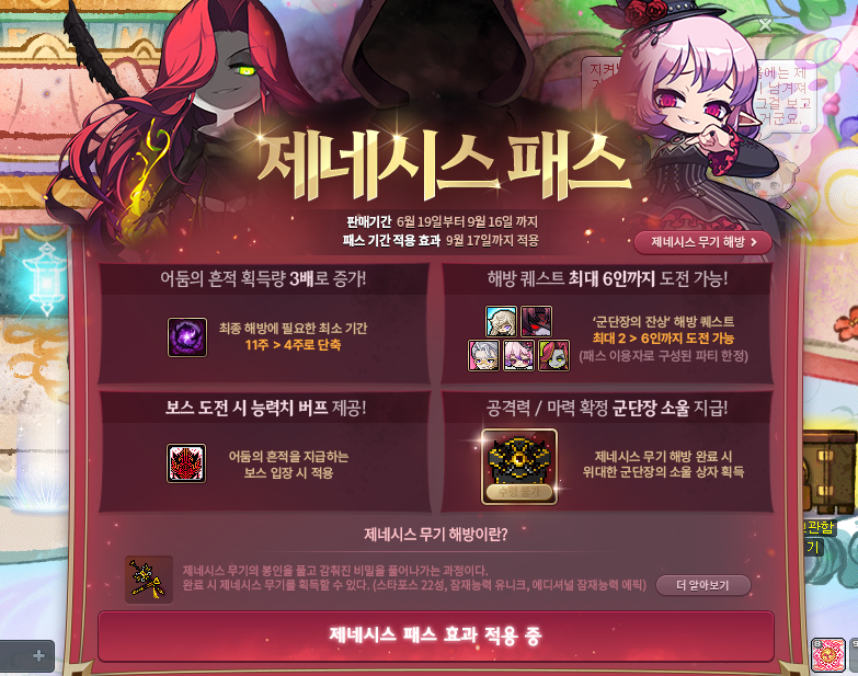 이에 더해 이번 여름 한정으로 판매 중인 ‘제네시스 패스’는 무기 해방까지 걸리는 시간을 획기적으로 줄여주는 강력한 패스 아이템이다. 제네시스 패스를 활용하면 해방에 필요한 최소 기간이 기존 11주에서 단 4주로 줄어든다. 특히 ‘검밑솔’이라 불리는 검은 마법사 아래 단계 보스까지 솔로로 처치할 수 있는 유저라면 5주 만에 해방을 완료할 수 있어, 여름 이벤트 기간 내 해방이 무리 없이 가능하다.