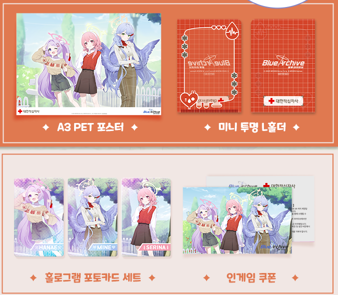 이번에도 트리니티 소속 ‘구호기사단’이 전면에 나서며, 새로운 일러스트가 적용된 굿즈가 제공되기 때문에 팬들의 기대를 모은다. 구성품은 포스터, 홀로그램 포토카드 세트, 미니 투명 L홀더, 인게임 쿠폰으로 총 4종이며, 헌혈 할때마다 한가지를 선택할 수 있다. 또한, 헌혈자 1인당 1세트를 증정받을 수 있다. 수량은 한정돼 있으므로, 대한적십자사 CRM센터를 통해 기념품 재고 현황을 사전 확인 후 방문하는 것이 좋다. 수량이 모두 소진되면 조기 종료된다.
