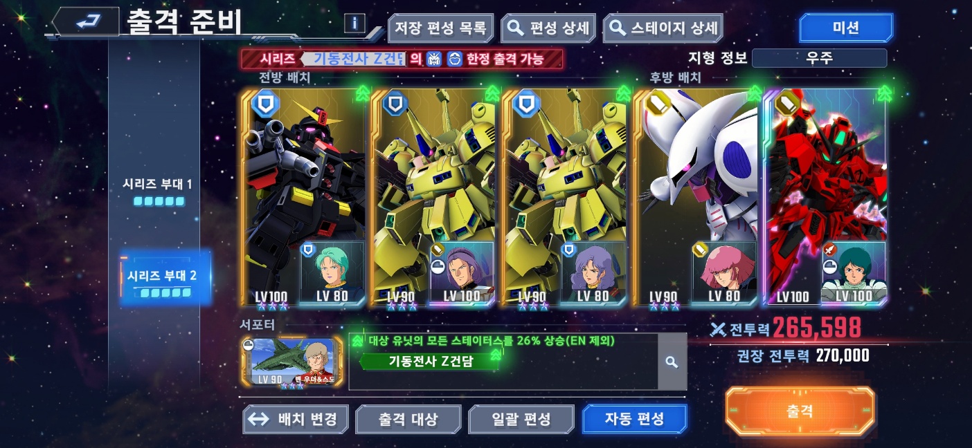 - 전광석화 혹은 Z건담 시리즈 서포트 UR 1개 이상 (풀돌된 SSR도 가능)