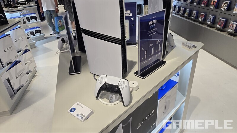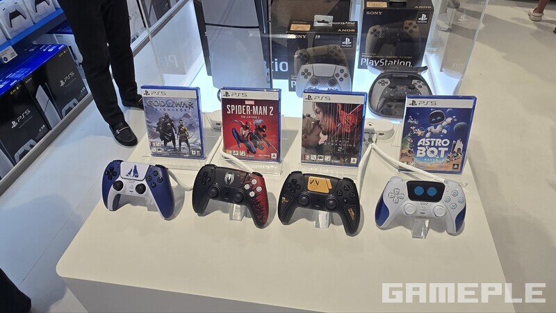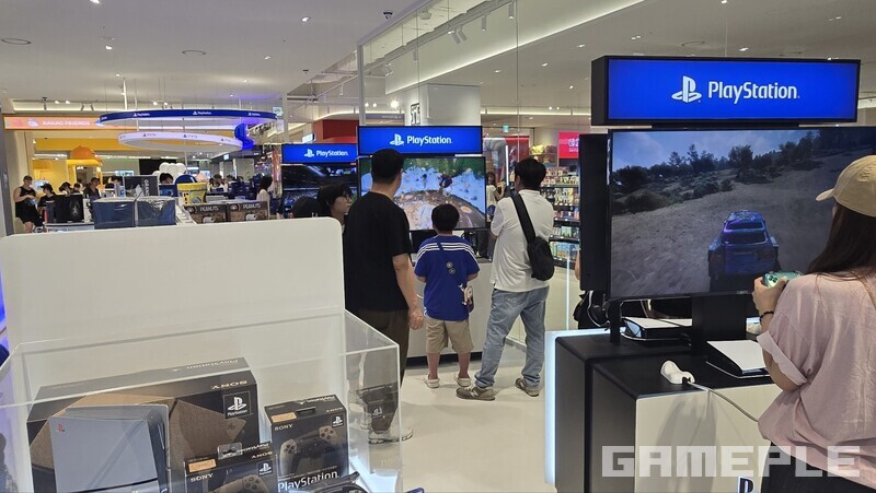 먼저 플레이숍을 살펴봤다. 이곳에는 다양한 PS5 본체와 소프트웨어, 주변기기를 다루고 있다. 다양한 게임 시연도 진행 중이며, 아이파크몰 특성상 가족 단위 나들이객도 많은 만큼, 넓은 연령대의 관람객들이 즐기는 모습을 볼 수 있다.