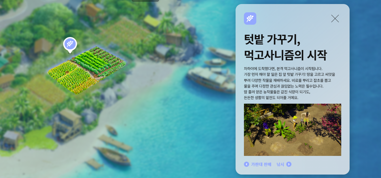 이번 업데이트로 유저들은 동남아시아 휴양지에서 영감을 받은 신규 지역 ‘차하야 섬’에서 새로운 인생을 체험할 수 있다. 차하야 섬에서는 생계 활동을 위한 세 가지 신규 노동이 추가된다. 농사, 낚시, 채광이다. 샌드박스형 시뮬레이션 게임에서 익숙한 콘텐츠다.