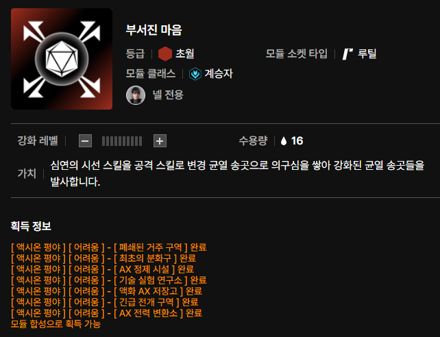 특히 많은 유저들의 선택을 받은 초월 모듈은 딜러로 활용하기 위한 ‘부서진 마음’이다. 이 때 보편적으로 사용하는 모듈 구성은 다음과 같다. 먼저, 트리거 모듈로는 ‘저편의 힘’을 사용해 전반적인 스킬 위력을 높이고, 스킬 모듈로 ‘부서진 마음’을 사용함에 따라 1번과 4번 스킬을 반복 운용하며 강력한 시너지를 낼 수 있다.