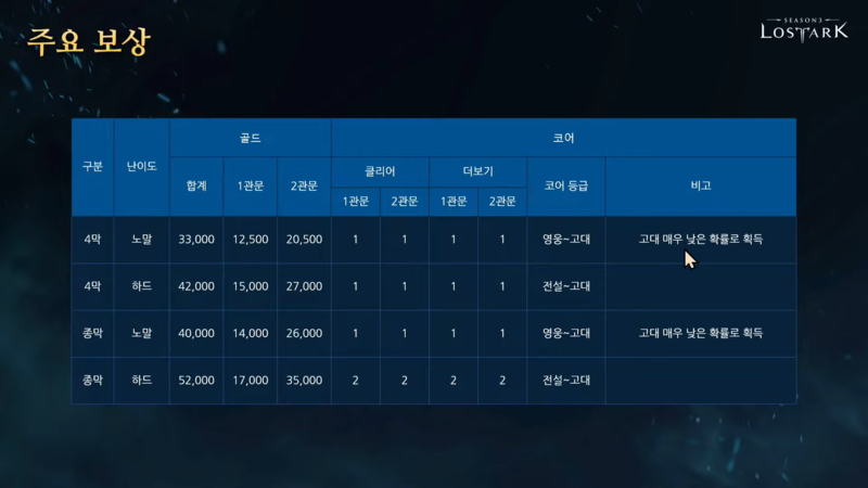 주요 보상은 골드 외에도 신규 시스템 아크 그리드의 핵심인 코어가 있다. 난이도를 불문하고 고대 등급까지 코어 획득이 가능하다. 단 노말 난이도에서 고대 코어를 획득할 확률은 매우 낮으며, 하드 난이도는 적어도 전설 이상 코어를 얻는다는 장점이 있다.