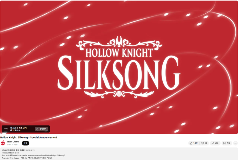 호주 개발사 팀 체리는 공식 유튜브 채널을 통해 '실크송' 특별 발표 일정을 알렸다. 영상은 21일 오후 11시 30분(한국시간) 공개된다. 게임 실제 플레이 영상과 주요 장면을 담을 것으로 예상되며, 출시일을 함께 공개할 가능성도 높게 점쳐진다.
