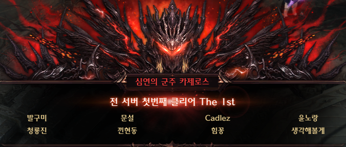 그밖에 '발구미', 'Cadlez', '힘꽁', '윤노랑', '생각해볼게', '낀현동'까지 8인 유저가 더 퍼스트 주인공이 됐다. 오직 1위에 오른 로아헌터스 멤버들만 더 퍼스트 칭호와 '신화가 된 카제로스 공격대' 트로피, '파멸' 모험가 배너, 기념비, 심연의 군주 카제로스 스태츄를 보상으로 받는다.