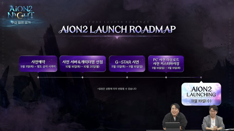 아이온2는 지스타가 끝난 직후인 11월 19일 0시 서비스를 시작한다. 사전 서버 및 캐릭터명 선점 이벤트는 10월 16일부터 20일까지 열린다. 캐릭터명을 한 번 정하면 바꿀 수 없으니 주의가 필요하다. PC 사전 다운로드 및 커스터마이징은 11월 16일부터 18일까지 가능하다.