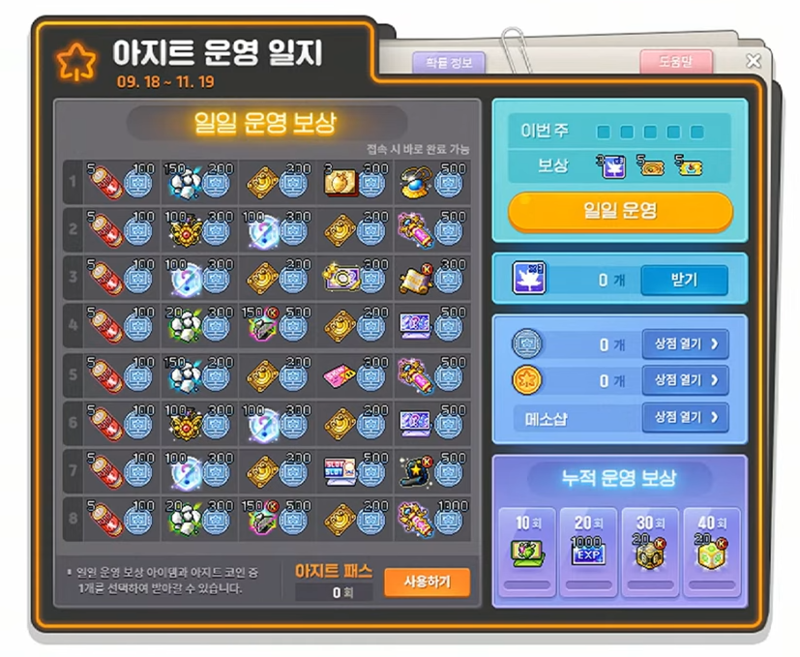 먼저, 이번 여름을 책임진 ‘에버니아의 선물’ 출석 이벤트가 끝나면서 11월 19일까지 진행되는 메인 출석 이벤트 ‘아지트 운영 일지’가 시작됐다. 이번 이벤트는 기존출석 이벤트와 유사한 방식으로, 하루 한 번, 주 5회까지 출석이 가능하다.