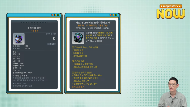 세 번째는 신규 하트 ‘플라즈마 하트’의 추가다. 지난 8월 페어리 하트와 컴플리트 언더컨트롤 사이에 있던 블랙 하트가 사라지면서 중간 단계의 하트가 등장할 것이라는 예측이 많았다. 많은 유저들의 예측대로 130레벨 이상부터 장착할 수 있는 신규 기계 심장 ‘플라즈마 하트’가 추가됐다.