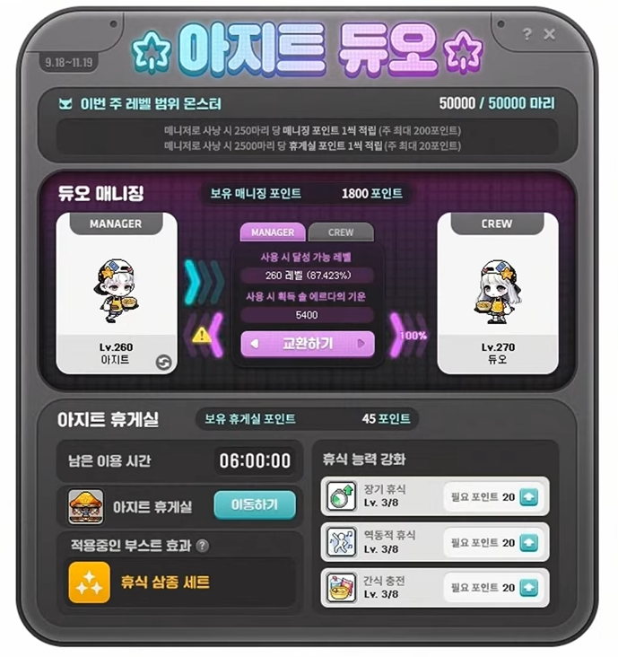 두 번째는 본캐와 부캐를 함께 성장시킬 수 있는 성장 공유 이벤트 ‘아지트 듀오’다. 260레벨 이상의 캐릭터 두 개를 선택해 이벤트에 참여할 수 있으며, 한 캐릭터는 매니저, 다른 캐릭터는 크루로 지정한다.