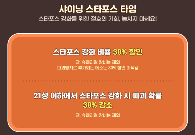 이번 샤타포스 이벤트의 핵심 혜택은 ‘스타포스 강화 비용 30% 할인’과 ‘21성 이하 장비 강화 시 파괴 확률 30% 감소’다. 강화에 필요한 메소 부담을 크게 줄여주고, 장비가 파괴될 위험까지 완화해 주기 때문에 많은 유저들이 이 날을 기다려온 만큼 대규모 강화가 이루어질 것으로 예상된다.