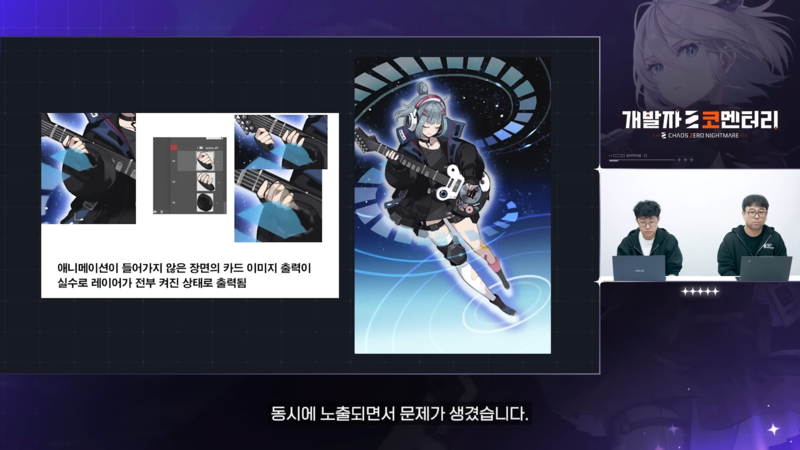 '니아' 아다지오 카드의 손가락 6개는 애니메이션 연출을 위해 제작된 레이어가 감춰지지 못해 겹쳐서 나온 현상으로, 수정이 완료됐다. 각 레이어가 실제 연출되는 구조를 통해 근거를 제시했고, 앞으로 더 철저한 검수를 약속했다.