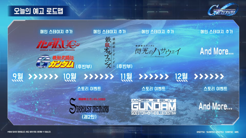 반주년 후 업데이트될 기체과 캐릭터 로드맵도 공개했다. 10월 중순부터 하순까지 '기동전사 건담 0083 스타더스트 메모리' 제2탄 스토리 이벤트, '기동전사 건담 철혈의 오펀스' 후반부 메인 스테이지가 열린다.