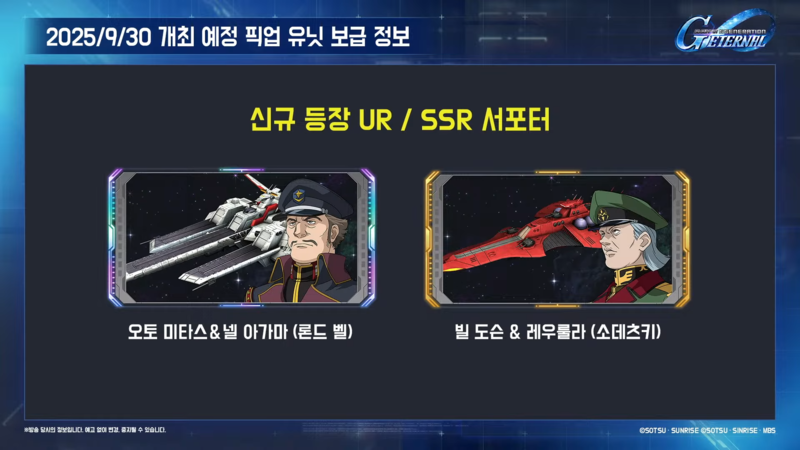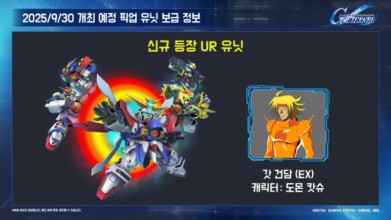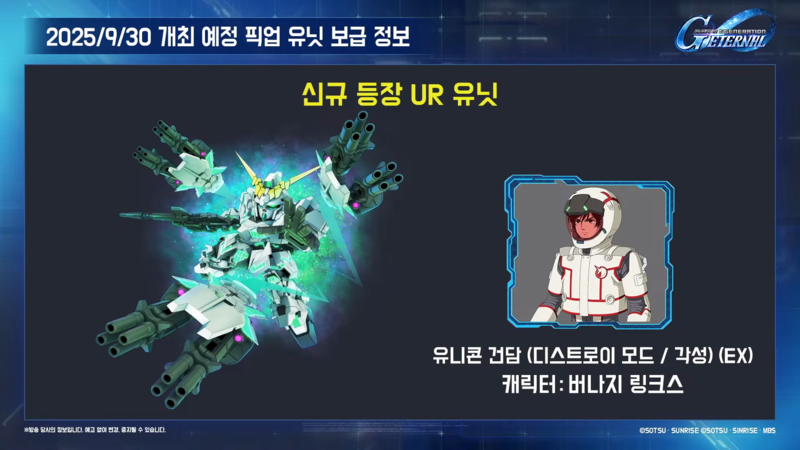 30일 신규 등장 UR 유닛은 유니콘 건담(디스트로이 모드/각성)(EX), 갓 건담(EX), 건담 F91(EX) 총 3종이다. 캐릭터는 원작 주인공들인 버나지 링크스, 도몬 캇슈, 시북 아노다. 신규 서포터는 UI 등급 '오토 미타스&넬 아가마', SSR 등급 '빌 도슨&레우룰라'다.
