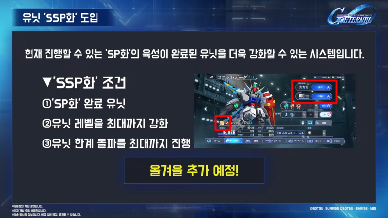 이어서 겨울 내 추가 예정인 대규모 신규 시스템을 공개했다. 바로 유닛 'SSP화'다. 현재 SP화 육성이 완료된 유닛을 더욱 강화할 수 있게 된다.