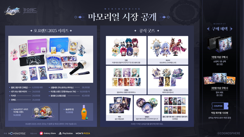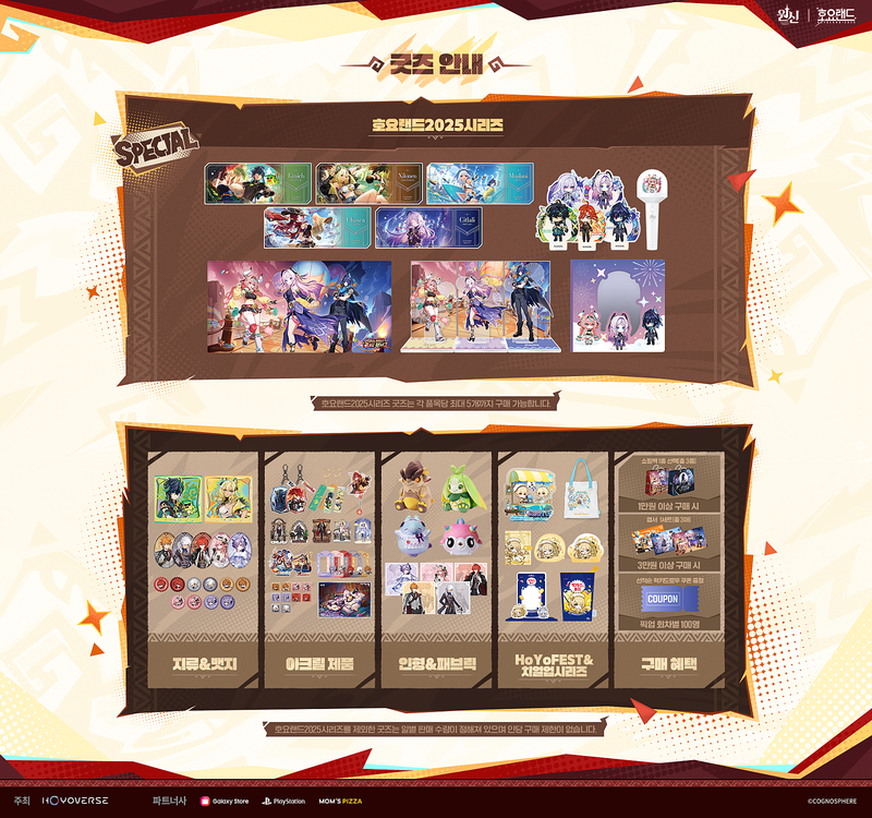 호요랜드 2025에서만 만날 수 있는 한정 굿즈는 아크릴 스탠드, 장패드, 응원봉 등이 보인다. 여기에 카스토리스 혹은 파이논으로 구성된 선물 세트가 핵심이다. 선택한 캐릭터의 양면 회전 아크릴 스탠드, 맥세이프 카드케이스와 그립톡이 구성물이다. 마그네틱 링도 포함되어 어떤 기종이든 장착과 교체가 가능하다.