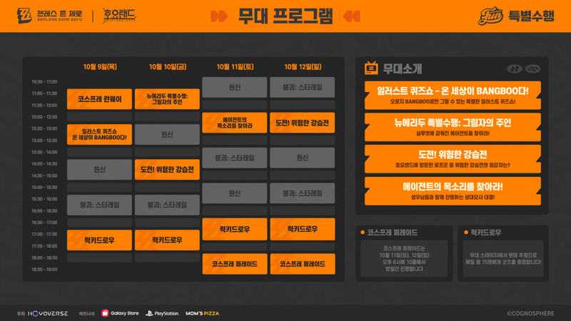 무대 이벤트는 특별한 아이디어 위주로 구성됐다. 오직 방부로만 그릴 수 있는 일러스트 퀴즈쇼, 실루엣을 보고 에이전트 찾기, 위험한 강습전 대결 등이 이어진다. 또 주요 성우들과 함께 진행하는 성대모사 대결도 많은 재미를 가져올 것으로 보인다.