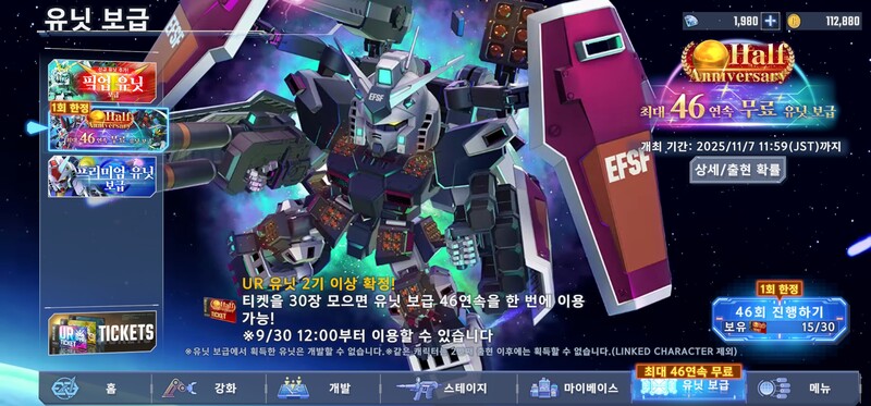 특히 이번 반주년은 새로운 유저들이 정착하기에 최고의 기회로 꼽힌다. 특별한 과정 없이 바로 며칠만 플레이해도 최고급 유닛들과 넘치는 재화를 얻을 수 있기 때문. 건담이나 SRPG에 관심이 있지만 미처 접하지 못한 유저들에게 가장 좋은 시기다.
