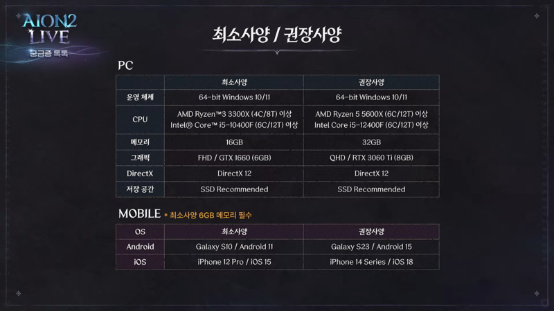 최소 사양과 권장 사양에 대한 정보도 공개됐다. 현재도 최적화 작업이 한창이라 사양은 더 낮아질 가능성이 있다고 전했다. 다만 모바일에서는 메모리가 핵심으로, 4GB 환경에서는 플레이가 불가능하며 6GB 이상부터 원활한 이용이 가능하다. 그래픽 관련해서는 DLSS 지원을 예고했으며, 콘솔 버전은 아직 준비 단계다.