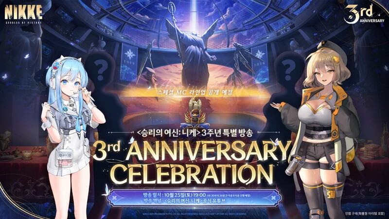 시프트업과 레벨 인피니트는 '니케' 3주년 기념 특별 방송을 10월 25일 오후 7시 개최한다고 알렸다. 방송은 기존 주년과 같이 공식 유튜브를 통해 송출된다. MC 캐릭터는 매번 특별 방송에서 함께 한 '아니스'와 '시프티'다. 다만 이미지를 통해 스페셜 MC 두 명이 합류하는 사실이 알려졌다.