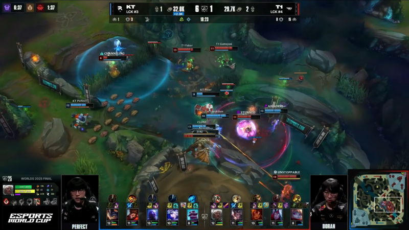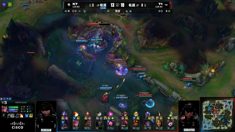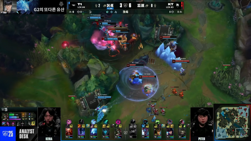 이후 성장한 두 탱커는 T1이 감당할 수 없는 수준으로 단단해졌고, 한타마다 KT가 승리했다. 결국 커즈의 문도박사는 노데스로 경기를 마무리하며 팀의 2연승을 견인했다.