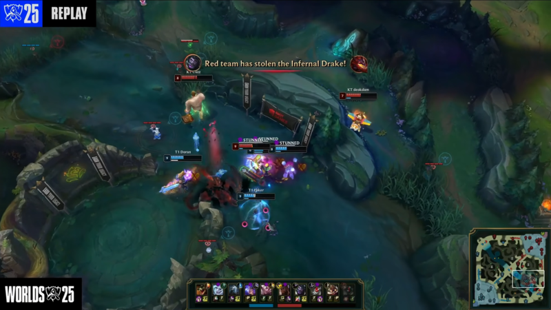 최종 5세트는 팽팽한 긴장감 속에 시작됐다. T1 ‘오너’는 판테온을 선택해 초반부터 KT의 상체를 집요하게 압박했고, ‘퍼펙트’의 요릭을 성장하지 못하게 묶어두었다.