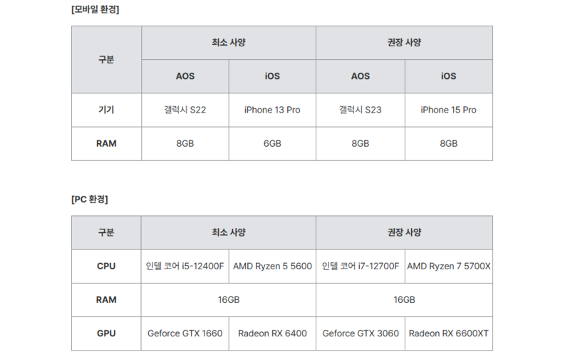이번 CBT의 최소 사양 정보도 공개됐다. 모바일의 경우 안드로이드는 갤럭시 S22(램 8GB), iOS는 아이폰 13 프로(램 6GB) 이상이 최소 사양이며, 권장 사양은 8기가 램의 갤럭시 S23, 아이폰 15 프로다. PC 버전은 최소 사양이 16GB 램, 그래픽카드 GTX 1660, 권장 사양은 16GB 렘, 그래픽카드 GTX 3060으로 제시됐다. 모바일과 PC 간 크로스 플레이가 지원되는 만큼, 다양한 환경에서 쾌적하게 즐길 수 있을 것으로 예상된다.