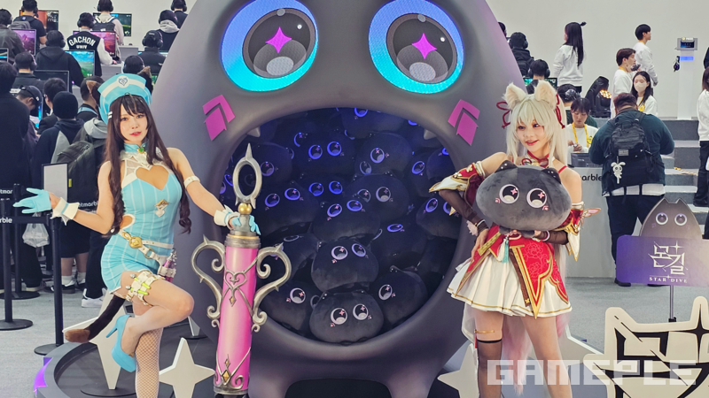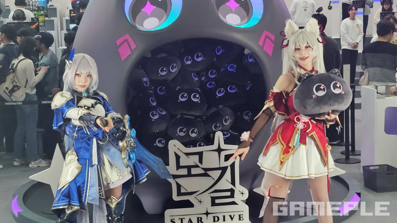 부스 내부는 '몬길: 스타 다이브'의 마스코트인 거대 야옹이가 전시됐다. 또 정면에 '이블베인' 속 중갑옷을 입은 기사가 입체적으로 움직이는 화면 속에서 자세를 잡는다. 이를 촬영하고 인증하는 이벤트를 통해 선물을 주기도 한다.