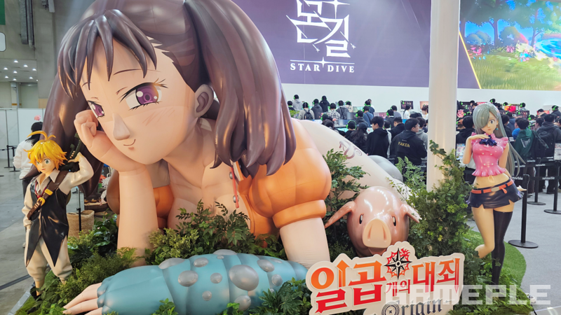 부스 곳곳에 정성들여 제작해 세운 전시물부터 분위기를 살린다. 왼쪽으로 '일곱 개의 대죄' 인기 캐릭터 '다이앤'의 대형 조형물이 관람객들을 바라본다. 오른쪽에는 '나 혼자만 레벨업'의 성진우가 움직이는 홀로그램으로 등장해 포토존 분위기를 돋운다.