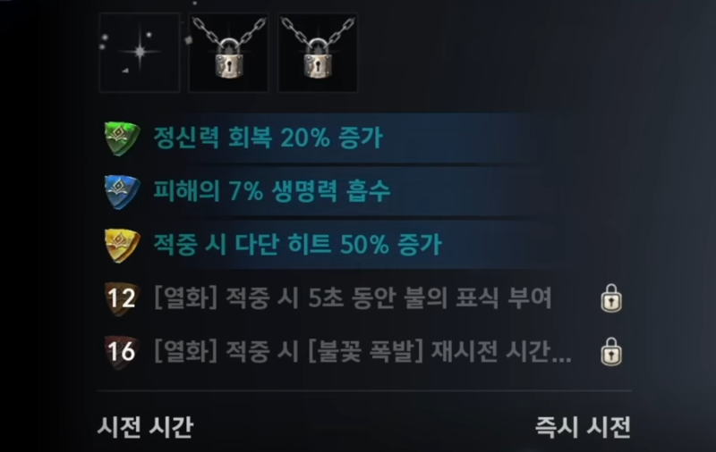 성장에서 스킬 레벨은 특히 중요하다. 마스터리 기준 8레벨 이상이 되면 강력한 추가 옵션이 활성화되기 때문이다. 5종류 옵션 중 3개가 8레벨에 풀리기 때문에 가장 핵심이고, 나머지 두 옵션은 각각 12레벨과 16레벨에 풀린다.