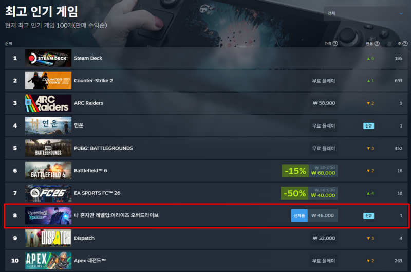 한편, 나혼렙 오버드라이브가 스팀 글로벌 판매량 8위에 진입하면서, 10위권 안에 국내 게임사들의 강세가 돋보인다. 3위에 넥슨의 ‘아크 레이더스’, 5위에 크래프톤의 ‘배틀그라운드’, 8위에 넷마블의 ‘나혼렙 오버드라이브’가 이름을 올리며 상위 10위권 중 3개가 국내 게임사 퍼블리싱 게임으로 채워졌다.